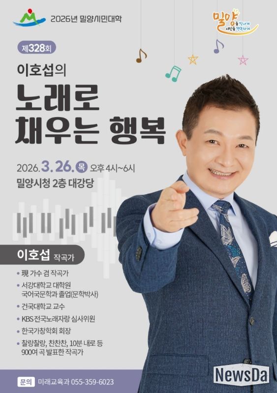 뉴스다 최광묵 기자 | 경남 밀양시는 오는 3월 26일 오후 4시 시청 대강당에서 제328회 밀양시민대학 강연을 개최한다. 이번 강연은 대한민국 대표 작곡가이자 방송인인 이호섭 씨를 초청해 ‘노래로 채우는 행복’이라는 주제로 진행된다.
