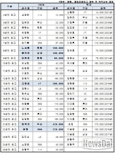 또한 2026시즌부터 시행되는 아시아쿼터 선수들의 연봉도 집계됐다. LG 웰스, SSG 타케다, 두산 타무라가 각각 20만 달러씩 받으며 아시아쿼터 선수 연봉(계약금 포함) 공동 1위에 올랐다.