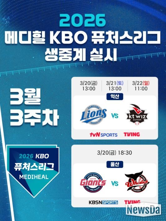뉴스다 류대현 기자 | KBO는 3월 20일(금) 개막하는 2026 메디힐 KBO 퓨처스리그 경기를 TV 채널 tvN SPORTS, KBSN SPORTS와 OTT 플랫폼 TVING을 통해 생중계 한다.