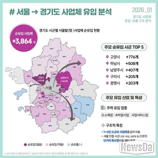 지난 1월 경기도일자리재단이 발표한 ‘경기도 사업체 유입·유출 구조 분석’에 따르면, 2022년부터 2025년까지 최근 3년간 서울에서 고양시로 순유입된 사업체 수는 총 776개로, 경기도 31개 시군 가운데 가장 많은 규모를 기록했다.