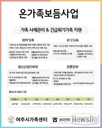 뉴스다 최광묵 기자 | 여주시가족센터는 복합적인 어려움을 겪는 가족을 발굴하고 지원하기 위해, 2026년 ‘취약·위기가족 지원사업(온가족보듬사업)’을 예년보다 확대하여 본격 가동한다고 밝혔다.