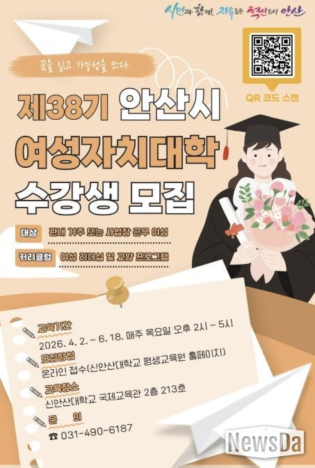 뉴스다 최광묵 기자 | 안산시는 지역 여성의 역량 강화와 리더십 함양을 위한 ‘제38기 안산시 여성자치대학’ 수강생을 모집한다고 20일 밝혔다.