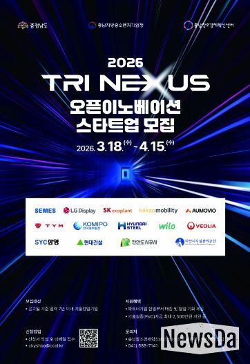 뉴스다 최광묵 기자 | (재)충남창조경제혁신센터는 대·중견기업(공기업)과 스타트업 간 오픈이노베이션을 통해 혁신기술의 산업 적용과 사업화를 지원하는 ‘2026 Tri Nexus 오픈이노베이션’ 프로그램에 참여할 스타트업을 오는 4월 15일까지 모집한다고 밝혔다.