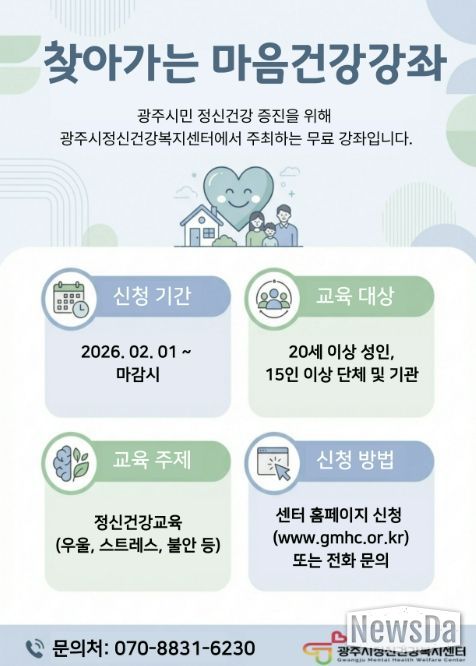 뉴스다 최광묵 기자 | 광주시정신건강복지센터는 지역 내 기관 및 단체를 대상으로 정신건강 인식 향상과 정신질환 예방을 위한 ‘2026년 찾아가는 마음 건강 강좌’를 오는 11월까지 운영한다고 20일 밝혔다.