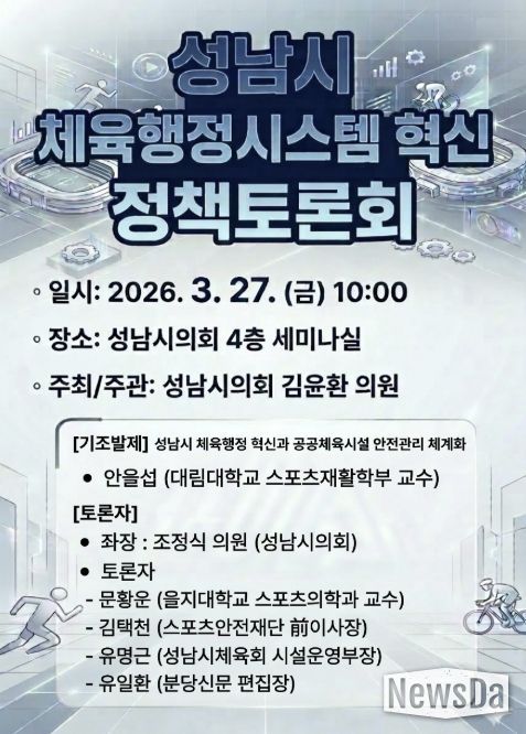 뉴스다 최광묵 기자 | 성남시의회 김윤환 의원(문화복지체육위원회)은 오는 27일, 성남시 체육행정의 혁신 방향을 모색하기 위한 '성남시 체육행정시스템 혁신 정책토론회'를 개최한다고 밝혔다.