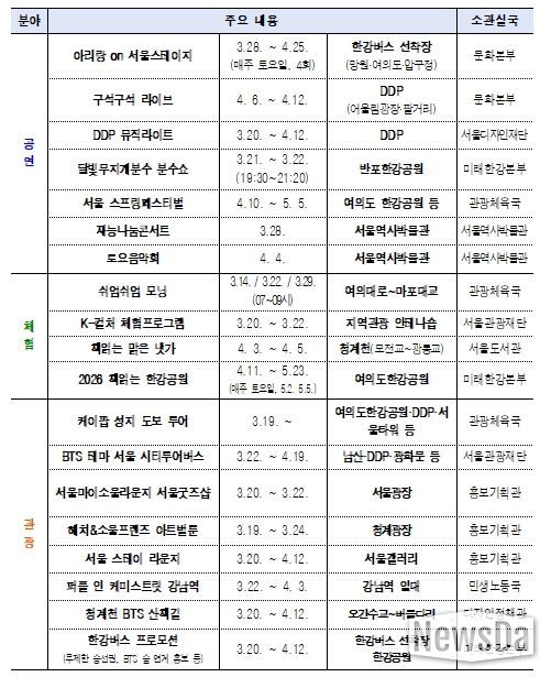 2026 서울스프링페스티벌(4.10.~5.5.), 동대문디자인플라자(DDP) 뮤직라이트쇼(4.6.~4.12.), K-pop 성지 도보관광코스(3.19.~), 서울스테이 라운지(3.20.~4.12.) 등을 3~4월 집중운영한다.