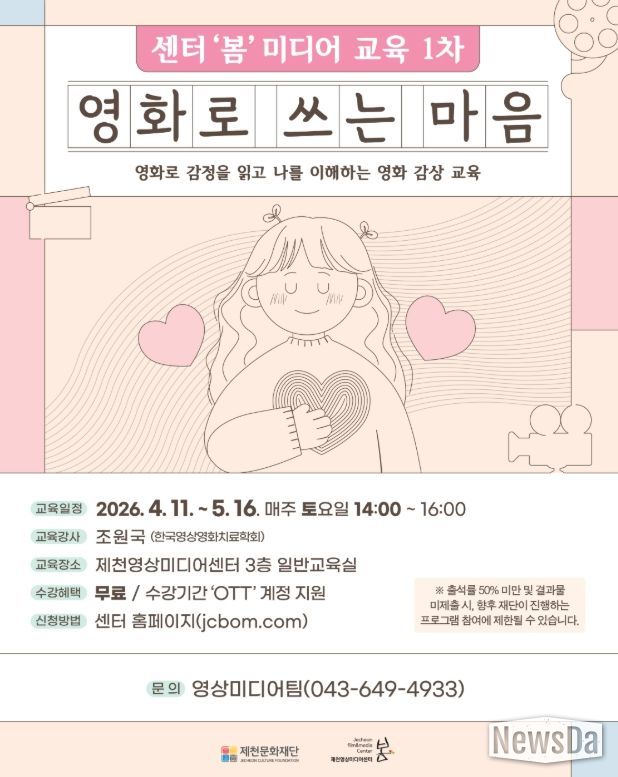 이번 교육은 영화를 매개로 자신의 감정을 돌아보고 타인에 대한 공감 능력을 높이는 프로그램으로, 제천영상미디어센터 3층 일반교육실에서 4월 11일부터 5월 16일까지 매주 토요일 오후 2시, 총 5회차에 걸쳐 진행된다.