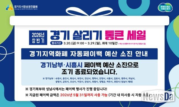 뉴스다 최광묵 기자 | 경기도시장상권진흥원은 도내 소상공인 매출 증대와 지역경제 활성화를 위해 추진하고 있는 ‘2026년 상반기 경기 살리기 통큰 세일’(이하 통큰 세일)이 도민들의 높은 참여 속에 일부 지역에서 조기 소진됐다고 25일 밝혔다.