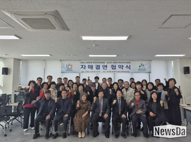 뉴스다 최광묵 기자 | 안양시 동안구 호계1동 주민자치위원회는 지난 25일 호계1동 행정복지센터에서 충북 괴산군 사리면 주민자치위원회와 상생 발전 및 도농 교류 활성화를 위한 자매결연 협약을 체결했다.