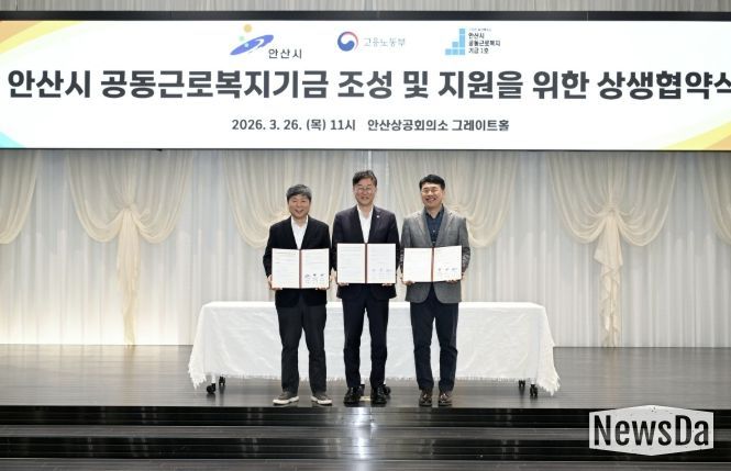뉴스다 최광묵 기자 | 안산시는 지난 26일 안산상공회의소 그레이트홀에서 경기지방고용노동청 안산지청, 안산시 공동근로복지기금 1호 법인과 함께 ‘안산시 공동근로복지기금 조성 및 지원을 위한 상생협약’을 체결했다고 27일 밝혔다.