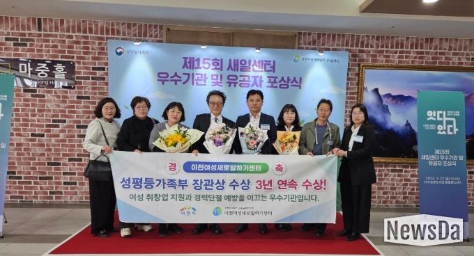 뉴스다 최광묵 기자 | 이천여성새로일하기센터(이하 이천새일센터)가 3월 27일 서울 마포중앙도서관에서 열린 ‘2026년 여성새로일하기센터 유공 포상식’에서 우수기관 및 종사자, 우수기업, 우수사례 등 4개 부문에서 성평등가족부 장관상을 수상했다.