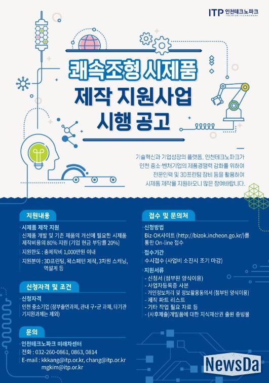 뉴스다 최광묵 기자 | 인천테크노파크(인천TP)는 인천지역 중소기업을 대상으로 3D 프린팅과 역설계 등을 활용한 ‘쾌속조형 시제품 제작 지원사업’의 참여기업을 모집한다고 밝혔다.