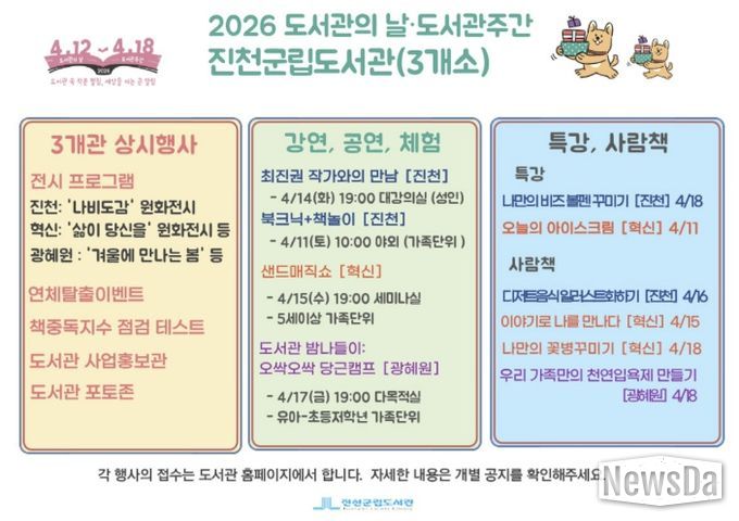 뉴스다 최광묵 기자 | 충북 진천군립도서관은 ‘2026 도서관의 날·도서관 주간’을 맞아 4월 11일부터 18일까지 관내 3개 도서관(진천군립·생거진천혁신도시·광혜원)에서 다양한 독서문화 행사를 운영한다.