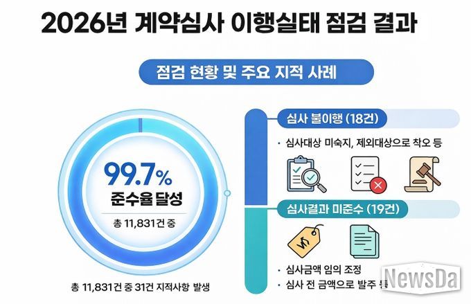 점검 결과 전체 대상 사업의 99.7%가 계약심사 절차를 정상적으로 이행한 것으로 나타났다. 적발된 지적 건수는 총 37건으로 전년 대비 3건 늘었지만 중대한 하자나 과다한 예산 손실 등의 문제는 발견되지 않았다. 지적 사항은 대부분 업무 미숙지 및 부주의에 의한 것으로 분석됐다.