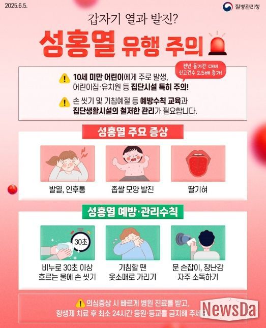 뉴스다 최광묵 기자 | 파주보건소는 최근 성홍열 발생이 증가함에 따라 영유아와 초등학생을 중심으로 감염 확산 방지를 위한 예방수칙 준수를 당부했다.