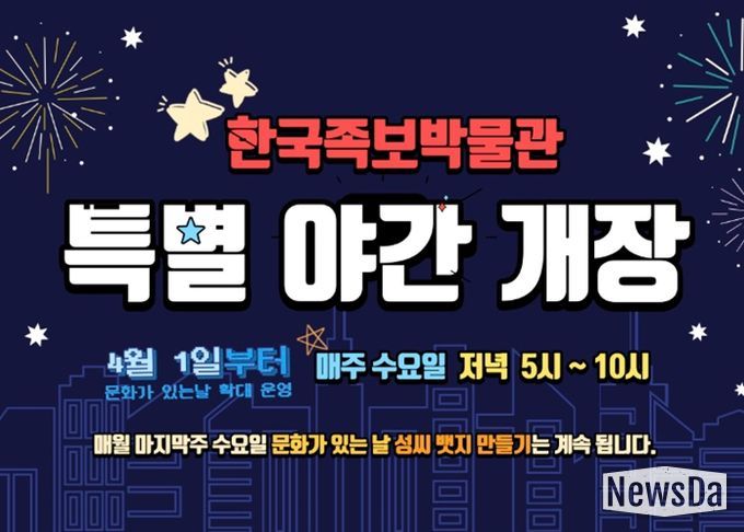 뉴스다 최광묵 기자 | 대전 중구 한국족보박물관에서는 오는 4월 1일부터 문화체육관광부가 지정한 ‘문화가 있는 날’정책이 매달 마지막 주 수요일에서 ‘매주 수요일’로 확대됨에 따라, 관람객들이 보다 편리하게 박물관을 이용할 수 있도록 매주 수요일 밤 10시까지 특별 야간 개장을 실시한다고 밝혔다.