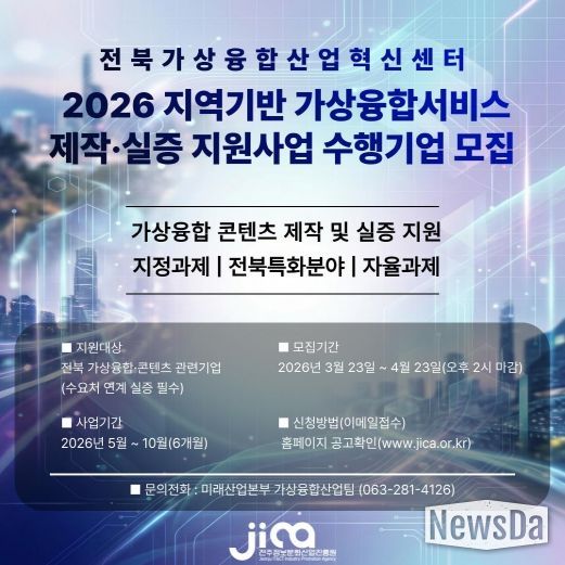 뉴스다 최광묵 기자 | 전주시와 (재)전주정보문화산업진흥원은 전북가상융합산업혁신센터의 지역 내 가상융합산업 인프라를 활용해 지역 현안을 해결하고 특화산업의 디지털 전환을 이끌 ‘2026년 지역기반 가상융합서비스 제작·실증 지원사업’의 수행기업을 모집한다.