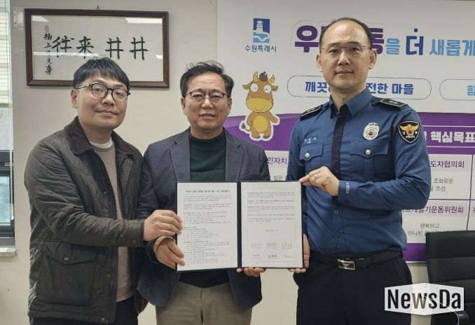 뉴스다 최광묵 기자 | 수원시 팔달구 우만1동은 2026년 3월 27일, 주민 생활안전 강화를 위한 ‘어두운 골목 태양광 센서등 설치사업’의 원활한 추진을 위해 우만1동 행정복지센터·우만1동 주민자치회·팔달경찰서 간 서면 업무협약을 체결했다.