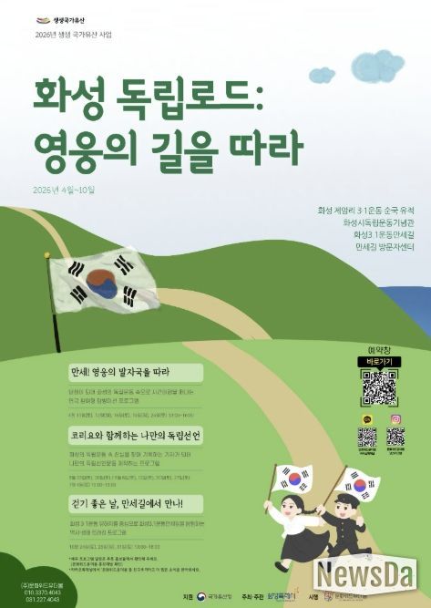 오는 4월에는 대표 프로그램인 ‘만세! 영웅의 발자국을 따라’를 진행한다. 참가자들은 화성 3·1운동 만세길을 직접 걸으며 스토리텔링형 연극에 참여해 당시 지역 독립운동의 열기를 경험할 수 있다. 프로그램은 무료로 제공하며, 3월 31일부터 포스터 하단의 QR코드를 이용해 참가 신청을 접수할 예정이다.