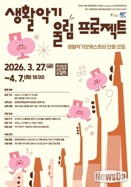 뉴스다 최광묵 기자 | (재)광명문화재단은 생활악기오케스트라 신규 단원을 3월 27일부터 4월 7일까지 12일간 모집한다.