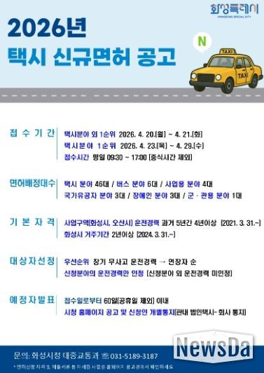 뉴스다 최광묵 기자 | 화성특례시가 시민들의 교통 불편을 해소하고 택시 공급을 확대하기 위해 개인택시 운송 사업 신규 면허 63대를 발급한다. 시는 지난 24일 고시된 경기도 택시 총량 심의 결과에 따라 제5차 택시총량제 증차 물량인 69대를 확보했으며, 이를 2026년 내 모두 공급할 계획이다.