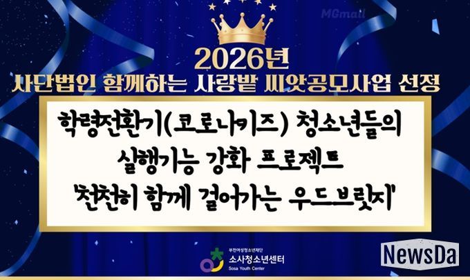 뉴스다 최광묵 기자 | 부천여성청소년재단이 운영하는 소사청소년센터가 사단법인 함께하는 사랑밭 주관 ‘2026년 함께하는 사랑밭 [씨앗공모사업]’ 기획공모 분야에 ‘학령전환기(코로나키즈) 청소년들의 실행기능 강화 프로젝트-천천히 함께 걸어가는 우드브릿지’ 프로그램이 선정됐다.