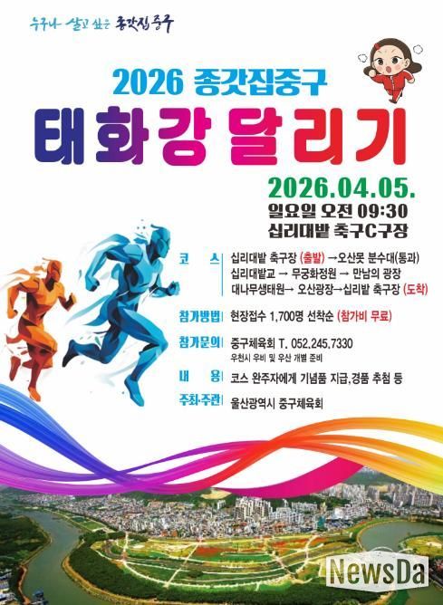 뉴스다 최광묵 기자 | 봄의 정취를 온몸으로 느낄 수 있는 ‘2026년 종갓집중구 태화강달리기’ 행사가 오는 4월 5일(일) 오전 9시 태화강국가정원 일원에서 열린다.