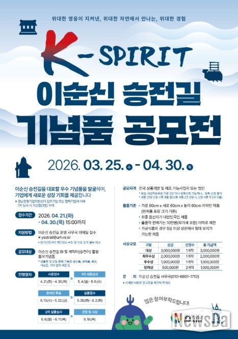 뉴스다 최광묵 기자 | 경상남도는 이순신 장군의 호국 정신이 깃든 ‘이순신 승전길’의 브랜드 가치를 높이고, 민간 주도의 유통·홍보체계를 구축하기 위해 ‘K-스피릿 이순신 승전길 기념품 공모전’을 개최한다고 밝혔다.