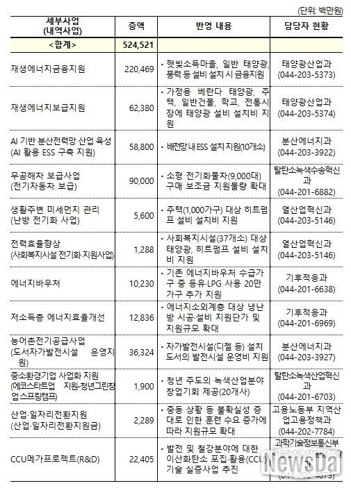 뉴스다 최광묵 기자 | 기후에너지환경부는 3월 31일 국무회의에서 재생에너지 중심으로 에너지 전환을 가속화하고 유가 상승에 따른 에너지 비용 부담을 완화하기 위해, 2026년도 기후에너지환경부 추가경정예산안 5,245억원을 편성했다고 밝혔다.