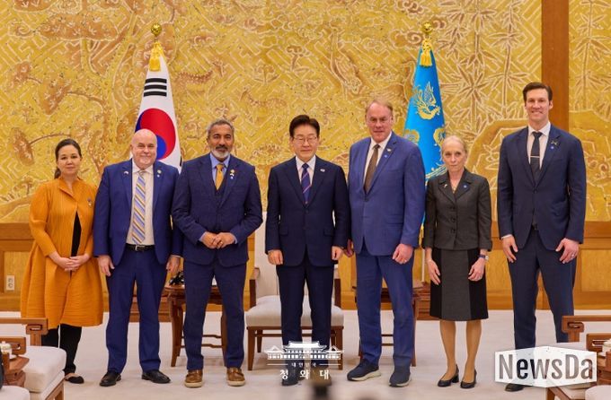 뉴스다 최광묵 기자 | 이재명 대통령은 3월 31일 오후 청와대에서 아미 베라(Ami Bera) 하원 동아태소위원회 간사 등 공화·민주 양당 의원으로 구성된 미국 의회 코리아스터디그룹 대표단을 접견하고 최근 중동 전쟁, 한미관계, 한반도 문제 등에 대해 의견을 나눴다.