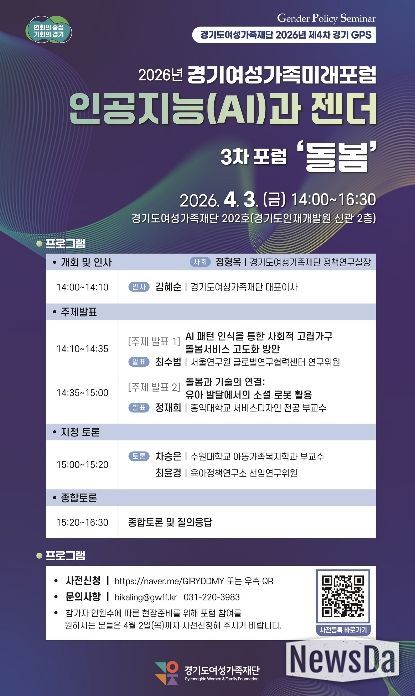 뉴스다 최광묵 기자 | 경기도여성가족재단은 3일 재단 회의실에서 ‘인공지능과 돌봄’을 주제로 경기여성가족미래포럼을 개최한다. 3월부터 5월까지 총 5차례 진행하는 경기여성가족미래포럼 중 이번이 3회차다.