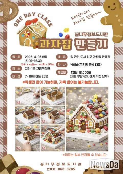 동두천시 도서문화사업소 꿈나무정보도서관에서는 이런 관심에 맞춰 오는 4월 26일 오후 3시부터 4시 30분까지 지하 1층 그림책정원에서‘책 읽고 과자집 만들기’ 일일 강좌(원데이 클래스)를 연다. 참가 신청은 4월 6일부터 선착순으로 진행되며, 모집 인원은 7세부터 10세까지의 아동 25명이다.