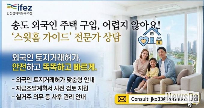 뉴스다 최광묵 기자 | 인천경제자유구역청은 송도국제도시 내 외국인의 주택 구입 편의를 높이고 안정적인 정주 여건 조성을 위해 외국인 토지거래허가 상담 서비스 ‘스윗홈 가이드’를 본격 시행한다고 밝혔다.