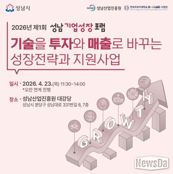 뉴스다 최광묵 기자 | 성남산업진흥원은 4월 23일 11시 30분부터 성남산업진흥원 대강당에서 '2026년 제1회 성남기업성장포럼'을 개최한다. 이번 행사는 기술 기반 투자유치와 중동사태 대응 방안을 중심으로 성남 기업의 매출 성장과 글로벌 진출을 모색한다.