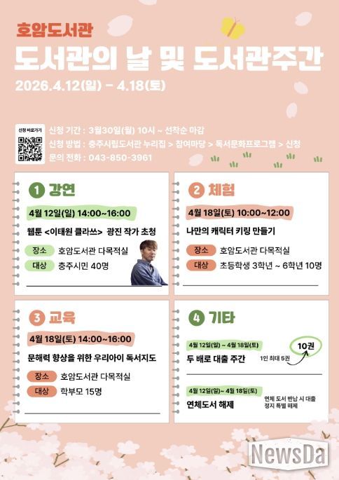 뉴스다 최광묵 기자 | 충주시 호암도서관은 제4회 ‘도서관의 날’과 제62회 ‘도서관주간’을 맞아 4월 12일부터 18일까지 7일간 다채로운 독서문화 행사를 운영한다고 2일 밝혔다.
