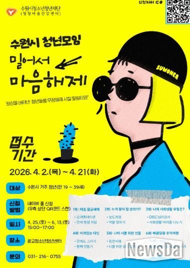 신청 기간은 오는 4월 2일부터 21일까지이며, 수원시에 거주하거나 활동하는 청년이라면 누구나 신청할 수 있다. 자세한 사항은 수원시청소년청년재단 홈페이지 또는 수원청년포털을 통해 확인할 수 있다.