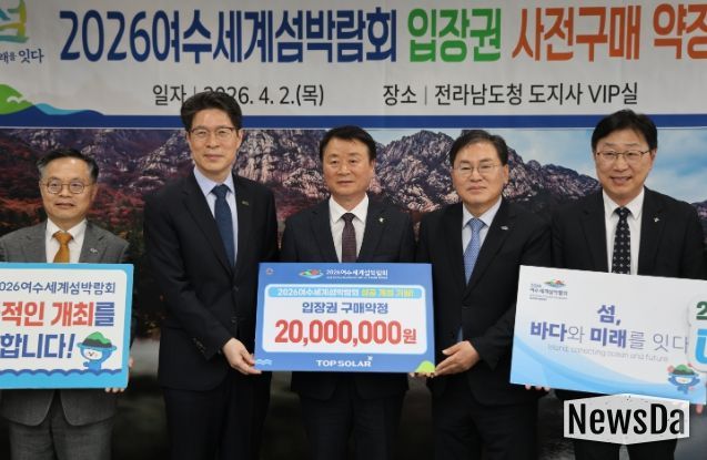 뉴스다 최광묵 기자 | (재)2026여수세계섬박람회조직위원회는 4월 2일 전남도청 VIP실에서 탑솔라㈜와 ‘2026여수세계섬박람회 입장권 구매약정식’을 개최했다고 밝혔다.