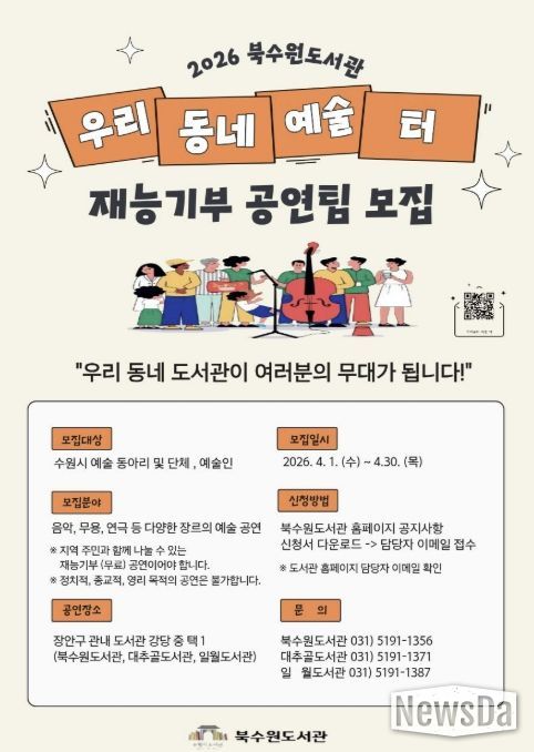 수원시 관계자는 “이번 사업은 이웃의 재능을 나누며 도서관을 소통의 공간으로 만드는 데 의미가 있다”며 “지역 예술인에게는 무대를, 시민에게는 문화 향유 기회를 제공하는 만큼 많은 참여를 바란다”고 말했다.
