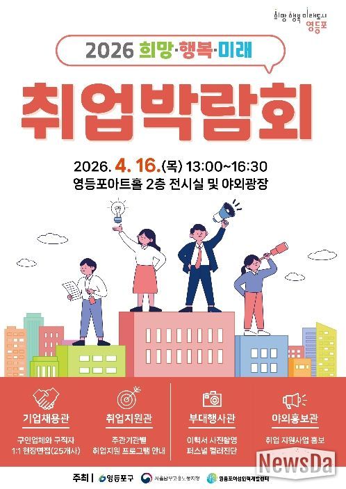 뉴스다 최광묵 기자 | 영등포구는 오는 4월 16일 영등포아트홀 2층 전시실 및 야외광장에서 320여 개 일자리를 제공하는 ‘2026 희망·행복·미래 취업박람회’를 개최한다고 밝혔다.