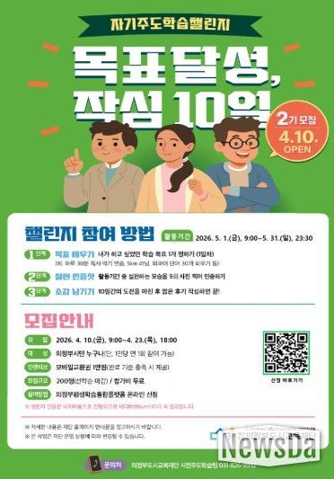 뉴스다 최광묵 기자 | 의정부도시교육재단은 시민의 일상 속 학습 실천을 응원하는 의정부시민대학 시민LAB 자기주도학습챌린지 ‘목표달성, 작심 10일’ 2기 참여자를 모집한다고 밝혔다.