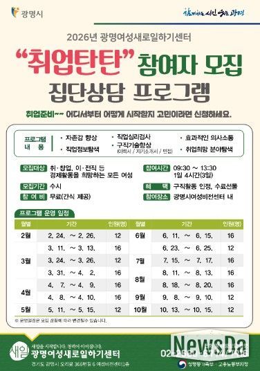 광명여성새로일하기센터는 취·창업과 이·전직을 희망하는 여성을 위해 ‘취업탄탄’ 집단상담 프로그램 참여자를 수시 모집하고 있다고 8일 밝혔다.