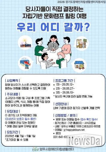 뉴스다 최광묵 기자 | 양주시장애인자립생활센터에서는 장애인 당사자가 직접 선택하고 결정하는 자립 기반 힐링 여행을 목적으로 하는 지역 장애인 문화캠프 [우리 어디 갈까?] 참가자를 모집한다.