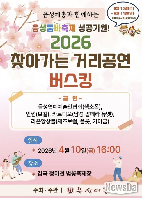 군 관계자는 “만개한 청미천의 벚꽃 아래서 가족, 연인, 친구와 함께 음악을 감상하며 잊지 못할 봄날의 추억을 만드시길 바란다”며 “앞으로도 지역 예술인들이 재능을 펼칠 수 있는 무대를 지속적으로 마련하고, 군민들이 일상 속에서 언제든 문화를 즐길 수 있는 ‘문화도시 음성’을 만들어가겠다”고 말했다.
