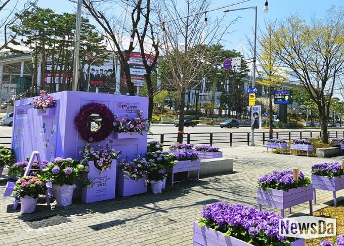 뉴스다 최광묵 기자 | (재)고양국제박람회재단은 ‘BTS 월드투어 아리랑 인 고양’를 맞이해 2026고양국제꽃박람회 사전 홍보를 위해 ‘보라빛 화훼 포토존’을 일산서구청 앞에 조성했다고 9일 밝혔다.