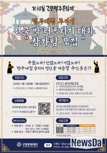 뉴스다 최광묵 기자 | 고양문화재단은 오는 6월 열릴 고양행주문화제의 대표 프로그램 중 하나인 행주대첩 투석전 ‘전국 박 터트리기 대회’의 참가팀을 오는 5월 8일까지 모집한다.