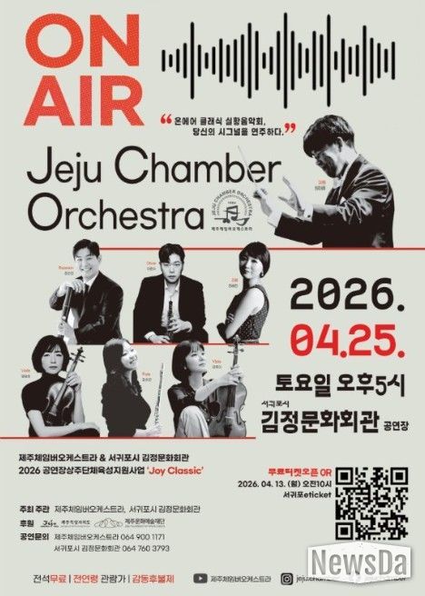뉴스다 최광묵 기자 | 서귀포시는 2026년 공연장 상주단체 육성지원 사업의 일환으로 제주체임버오케스트라의 공연 '온 에어'를 4월 25일 오후 5시에 김정문화회관에서 개최한다고 밝혔다.