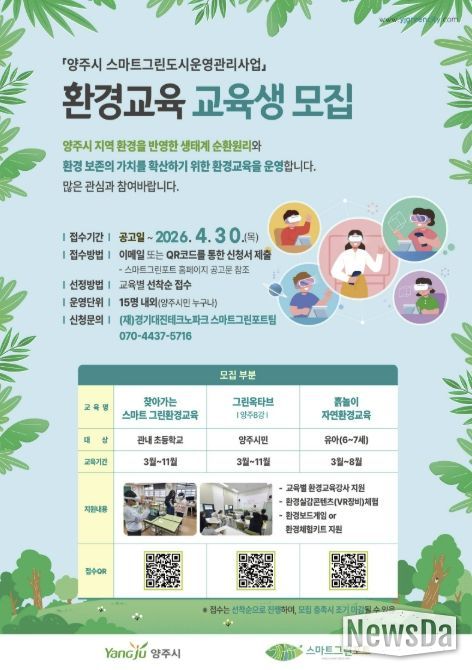 뉴스다 최광묵 기자 | 양주시가 스마트 그린도시 운영사업의 일환으로 2026년 환경교육 프로그램 참여자를 모집한다. 모집 대상은 양주시민이며, 신청은 4월 30일까지 가능하다.