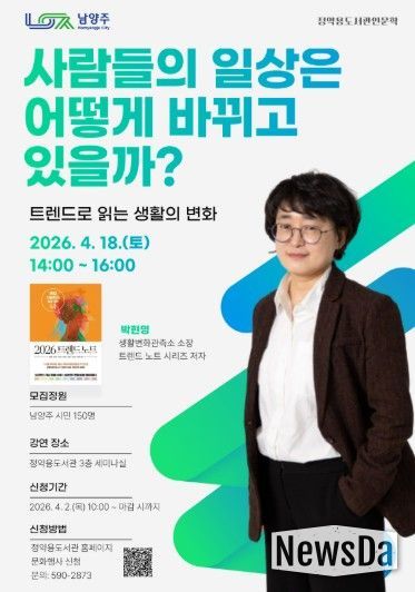 뉴스다 최광묵 기자 | 남양주시는 오는 18일 오후 2시 정약용도서관 3층 세미나실에서 시민 150명을 대상으로 ‘사람들의 일상은 어떻게 바뀌고 있을까’를 주제로 인문학 강연을 개최한다.