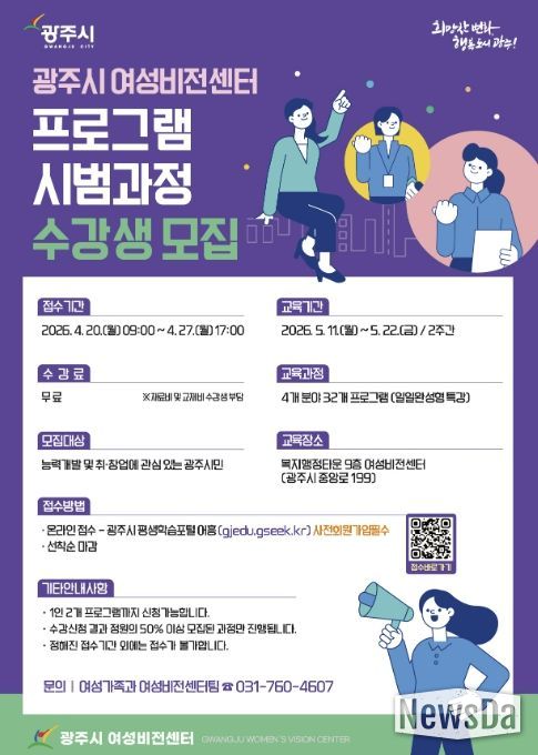뉴스다 최광묵 기자 | 광주시는 여성비전센터 개소 초기 인지도 확산과 안정적인 운영 기반 마련을 위해 오는 5월 11일부터 22일까지 2주간 상반기 프로그램 시범 과정을 운영하고 이에 따른 수강생을 모집한다고 15일 밝혔다.
