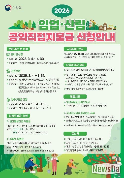 뉴스다 최광묵 기자 | 산림청은 2026년 임업·산림 공익직접지불금(임업직불금) 신청・접수가 4월 30일에 마감됨에 따라, 아직 임업직불금을 신청하지 않은 임업인들에게 기한 내 신청접수를 완료해 달라고 15일 당부했다.